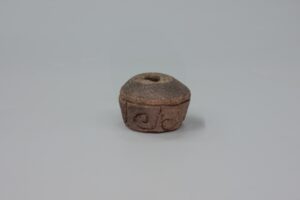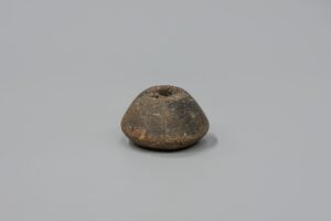 Fusaiola ibèrica de ceràmica comuna reduïda, de perfil cònic. Conté una doble inscripció circular en grafia ibèrica, feta en fresc -abans de la cocció-, a l'extrem ample de la peça.